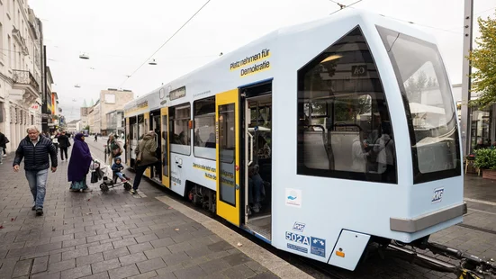 Es verbindet uns mehr als uns trennt – dafür ist die Straßenbahn ein wunderbares Bild. Um mit Menschen verschiedenster Hintergründe ins Gespräch zu kommen, weiten wir unsere Gesprächsangebote auf die Straßenbahn aus. Ein Beiwagen der Linie 1 wird so zum mobilen Diskursraum und fährt ab Oktober 2024 als Demokratiezug durcch Kassel: „Miteinander statt übereinander reden“ ist die Devise, mit der ausgebildete Diskursbegleiter:innen zu Gesprächen in der Tram einladen. Der Beiwagen ist im Design der Initiative gestaltet und wird vorerst auf der Linie 1 zwischen Wilhelmshöhe und Vellmar eingesetzt. Die moderierten Gespräche finden wöchentlich statt und bieten den Fahrgästen die Möglichkeit, miteinander über Themen zu sprechen, die sie gerade bewegen. Teilnehmen können alle Fahrgäste mit gültigem Fahrschein, die Aktionen integrieren sich in den regulären Fahrbetrieb.